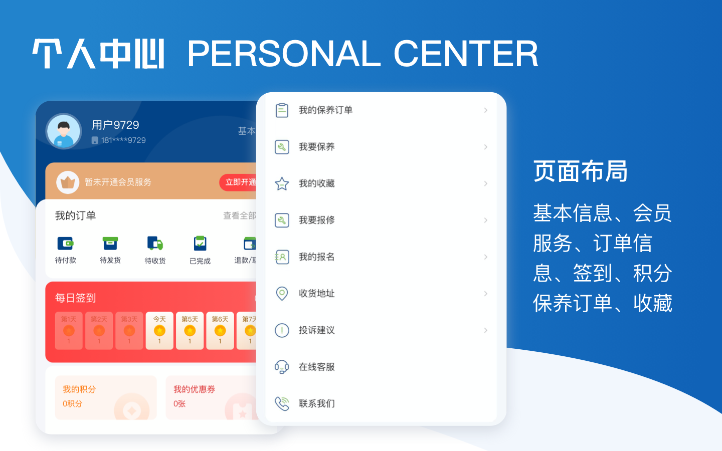 上門維修和保養(yǎng)服務系統(tǒng) 用戶線上提交報修需求清單后臺分配安排人員上門維修標記確認訂單完成在線服務商城,積分,優(yōu)惠劵抵扣會員卡管理會員等級服務