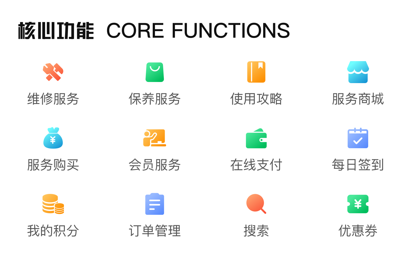 上門維修和保養(yǎng)服務系統(tǒng) 用戶線上提交報修需求清單后臺分配安排人員上門維修標記確認訂單完成在線服務商城,積分,優(yōu)惠劵抵扣會員卡管理會員等級服務